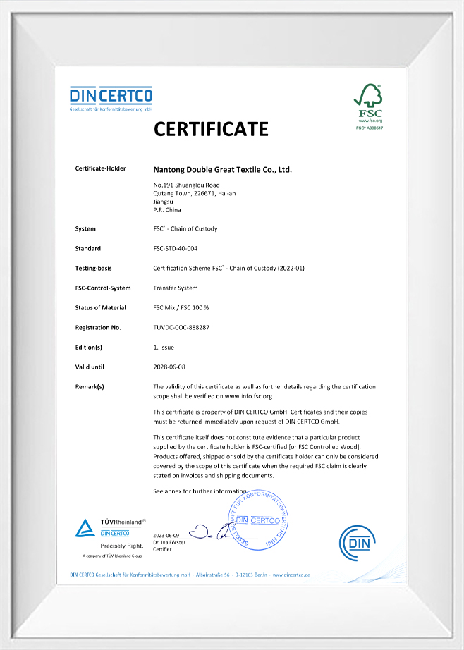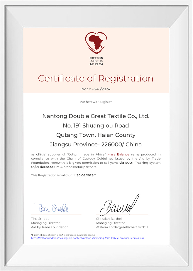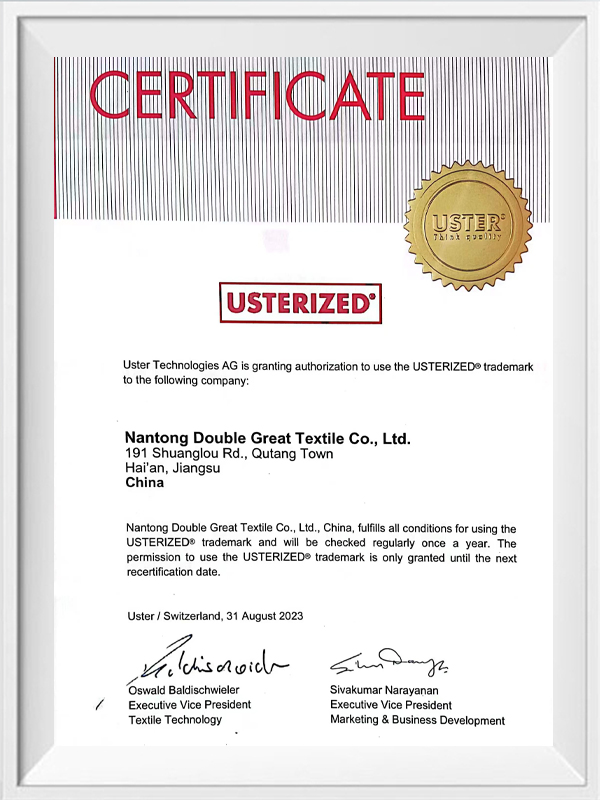 Nantong Double Great Textile Co.,Ltd. is een katoenen draaiende onderneming die de productie van hoogwaardige garens specialiseert. Het is de nationale basis voor de productie van hoogwaardige chemische fiber gemengd garens, de nationale basis voor het onderzoek en van het breien van garens, de nationale basis voor de ontwikkeling van gedifferentieerde groene garens, een van de top 20 producenten van polyester korte vezelgarens in, en een vice-voorzitter-eenheid van de Chinese katoentextiele industrie-vereniging. In de afgelopen veertig jaar heeft het bedrijf zich gericht op het produceren van hoogwaardige garens, die zich houden aan het principe van kwaliteit en excellentie.