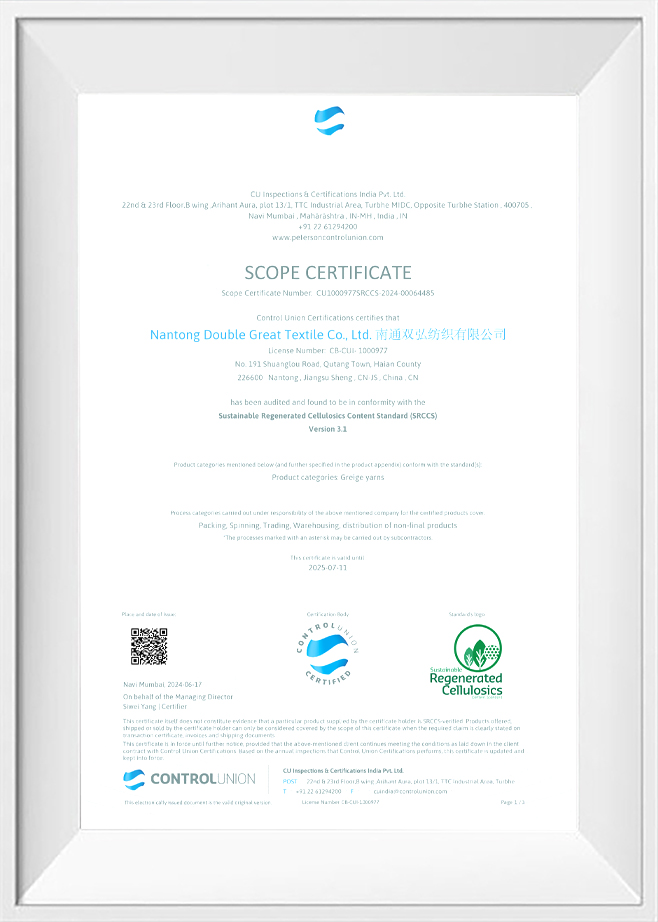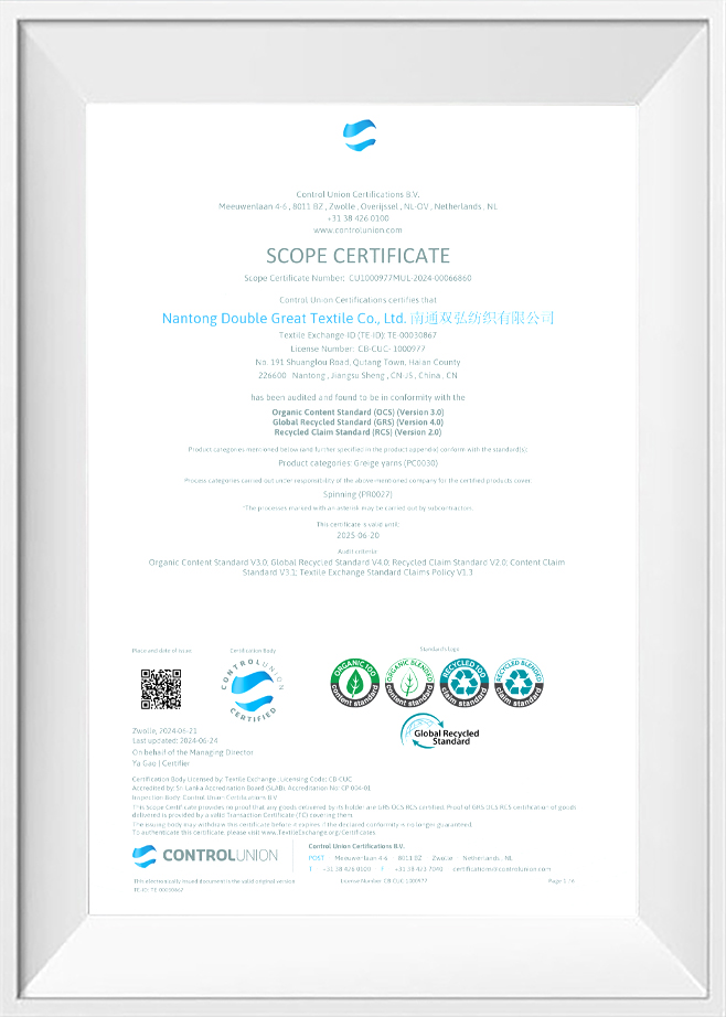 Kwaliteit en milieubescherming zijn onze verplichtingen aan onze klanten. Daartoe hebben we een aantal gezaghebbende certificeringen verkregen om de kwaliteit en milieubescherming van elke partij producten te waarborgen. Onze milieuvriendelijke garens hebben strikte tests en certificering doorgegeven, waaronder ISO 14001 milieubeheersysteem, professionele testen en certificering van antibacteriële en antistatische garens, enz. Dit verifieert niet alleen onze innovatievermogen, maar weerspiegelt ook onze inzet voor hoogstandaard milieuvriendelijke productie.