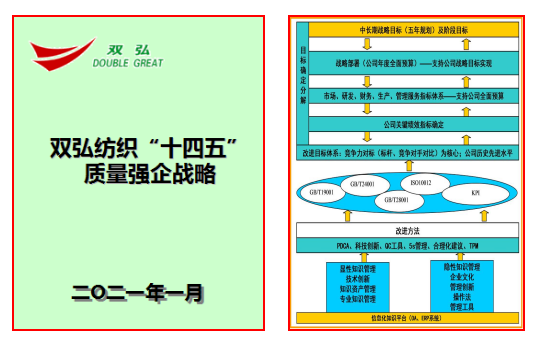 Kwaliteit is het leven van een onderneming. Als senior van het bedrijf heeft kameraad Ji Yijun de kwaliteitsverbetering altijd beschouwd als de topprioriteit van het bedrijf voor meer dan 40 jaar. Onder zijn schip en invloed heeft Double Great Company sinds 2007 het Performance Excellence Management -model geïntroduceerd en geïmplementeerd, waardoor de missie van "elk garen de waarde van zonneschijn is", de kernwaarden van "innovatie, kwaliteit, integriteit en harmonie", en de visie van "Longevity of Life, Evergreen Double Great". The refined quality management slogan "No matter how small the quality is, it is a big deal, no matter how difficult the quality is, it must be done well, and employees who do not pay attention to quality are not good employees" has been incorporated into the company's quality aphorisms, and the quality work motto "Quality will have a market" has become a quality concept known to everyone in the company, and has been promoted and disseminated to the entire industry through an exclusive interview with China Textile News.