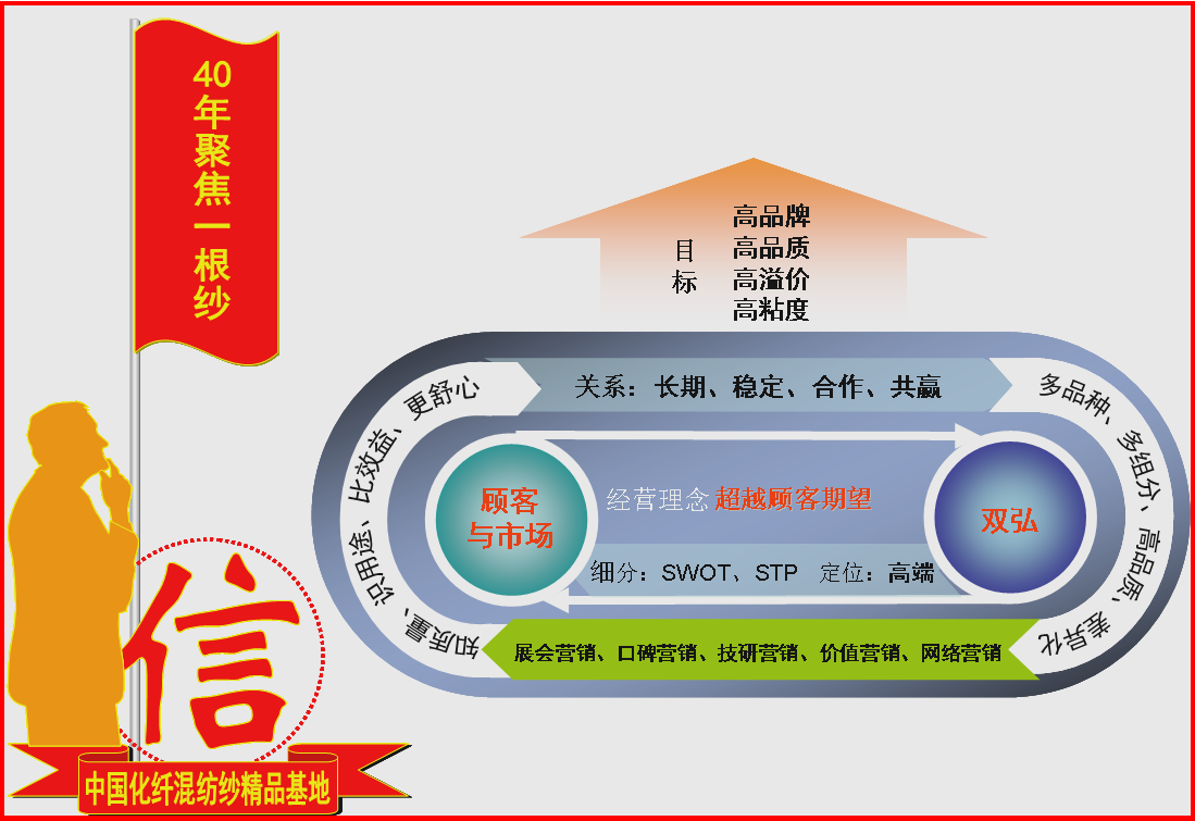 Focus op klanten en het verbeteren van merken zijn de resolute vereisten en stevige bezigheden van kameraad Ji Yijun in zijn werk. Under his advocacy, the company has formulated the business philosophy of "using the rigorous management, spinning the quality yarn, and climbing the -end customers", with "high brand, high quality, high premium, and high stickiness" as the goal, using "SWOT, STP" and other tools to investigate and segment the market, lock in key customer groups, adopt a "small batch, multiple varieties, fast delivery, high quality" fast marketing strategy, implement "exhibition marketing, word-of-mouth marketing, technical research marketing, knowledge marketing, value marketing, network marketing" and other methods, and use the "30 Articles of Double Great Service Guidelines" to let customers "know the quality, recognize the purpose, compare benefits, fast delivery, and more comfortable", establish a "long-term, stable, cooperative, and win-win" customer relationship, and form a highly competitive Double Great marketing model to win and maintain customer satisfaction and loyalty and achieve the common development of customers and Double Great.