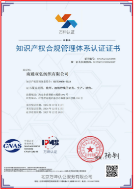 Certificering van de certificeringsbeheersysteem van intellectuele eigendom is een conformiteitsbeoordelingsactiviteit waarbij een certificeringsorgaan van derden het interne intellectuele onroerendgoedbeheersysteem van een onderneming evalueert om te bevestigen dat het voldoet aan de vereisten van relevante nationale normen of technische specificaties. Momenteel heeft Double Great Company 5 binnenlandse geregistreerde handelsmerken en 2 Madrid International Registred -handelsmerken. Het dubbele grote handelsmerk is een bekend handelsmerk in China; Het heeft meer dan 50 nationale uitvinding octrooien en patenten van het hulpprogramma's en won de China Textile Industry Patent Gold Award; Het heeft 4 nationale fakkel- en 5 Spark -planprojecten uitgevoerd; Het heeft 3 nationale normen, 11 industriestandaarden, 4 groepsnormen en 3 douaneverwerkende handelseenheid consumptiestandaarden geformuleerd; Het heeft industrie-universiteitsonderzoek uitgevoerd en 5 belangrijke technologie- en wetenschappelijke en technologische prestatieprojecten hebben de tweede prijs gewonnen van de Chinese textielindustriewetenschap en technologieproductie.