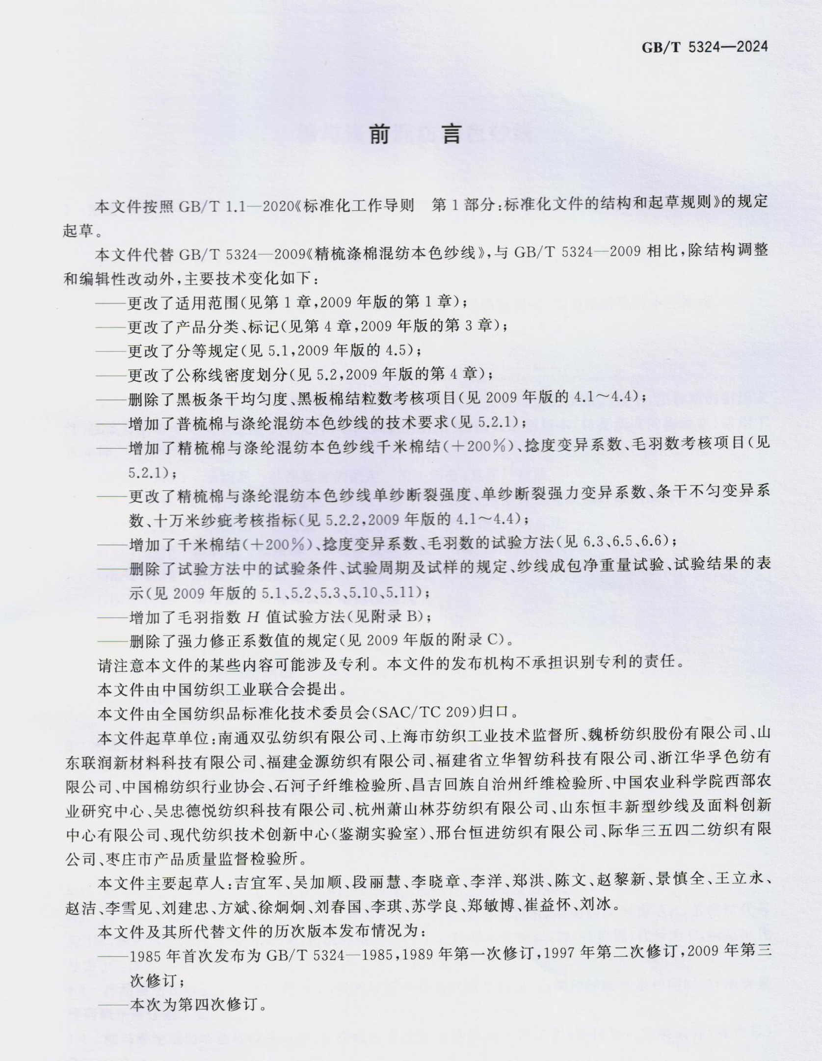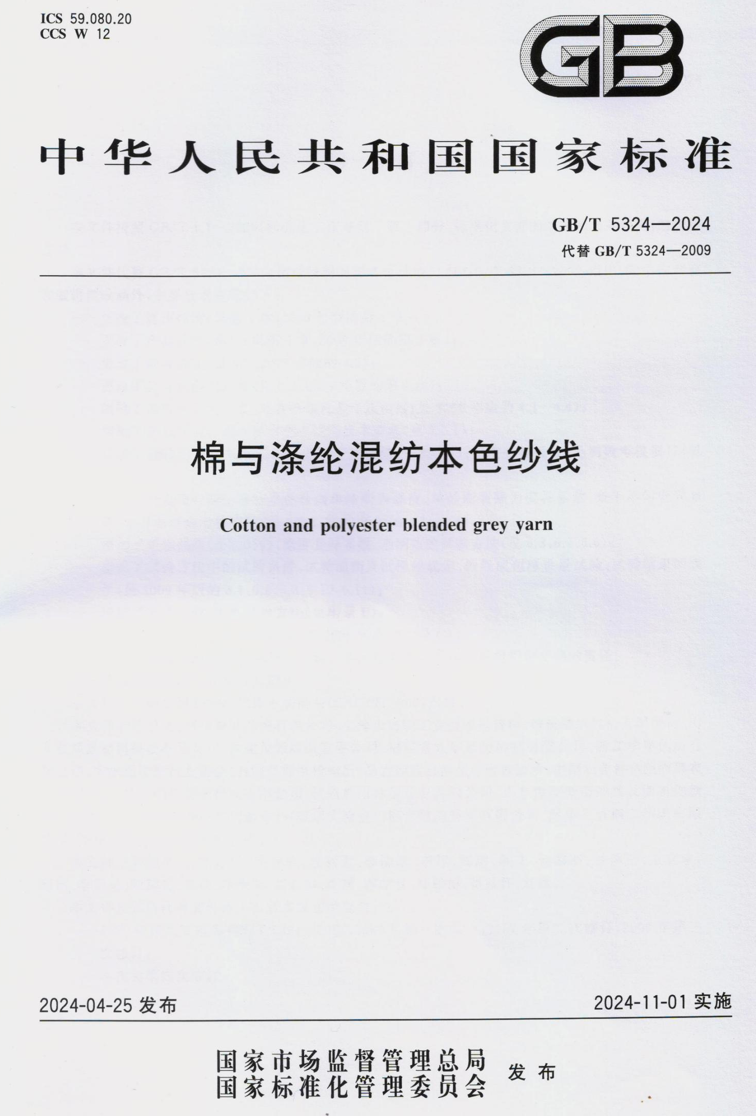 De National Standard GB/T 5324-2024 "Katoen en polyester Blended Natural Yarn" Opgesteld door Dubbel geweldig bedrijf zal officieel worden geïmplementeerd op 1 november 2024.