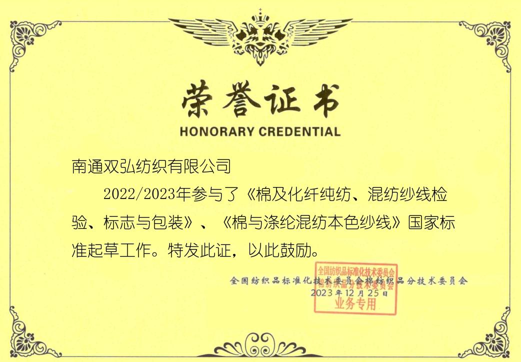 Als plaatsvervangend secretaris-generaal-eenheid van het National Technical Committee voor standaardisatie van katoentextiel en Een aangesloten eenheid van de Technical Committee for Standardization of China National Textile and Apparel Council, Double Great Company Actief neemt deel aan standaardisatie -activiteiten, neemt deel aan de formulering en herziening van verschillende normen, neemt het initiatief Om het opstellen en beoordelen van normen te ondernemen en veel waardevolle meningen naar voren brengt. Sommige innovatieve suggesties zijn aangenomen en gestold, waardoor de hoofdversie van standaardafstellen wordt. Double Great Company heeft achtereenvolgens geformuleerd 3 nationale normen, 11 industrienormen, 4 groepsnormen en 3 Customs Processing Trade Unit Consumption Standards, en won de titel van de nationale geavanceerde eenheid voor de normen van de textielindustrie en Nationale onderneming met uitstekende bijdragen aan textielstandaardisatie.