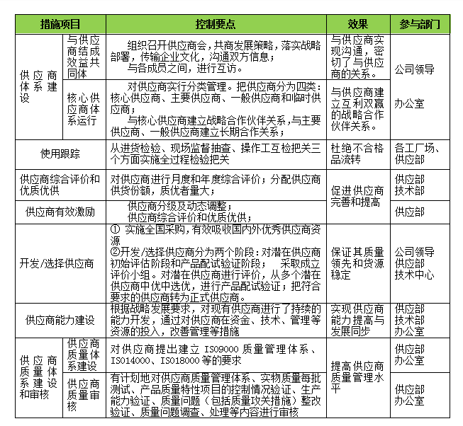 Gebruik evaluatie en stimuleringsmaatregelen voor leveranciers om zelfverbetering en continue verbetering van leveranciers te bevorderen; Introduceer hoogwaardige leveranciersbronnen door middel van leveranciersontwikkeling en constructie, verbetert de productieschaal en het managementniveau van bestaande leveranciers, verlagen inkoopkosten en verbetert het concurrentievermogen van de supply chain.